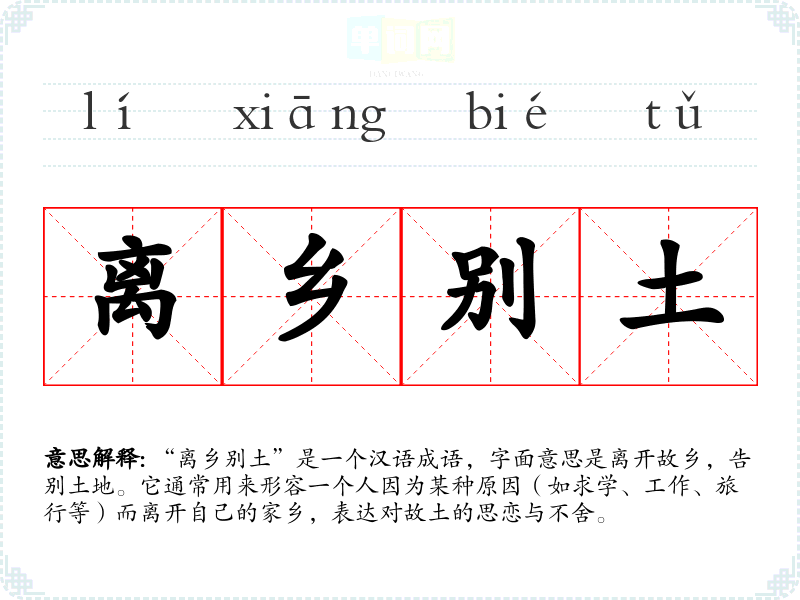 “离乡别土”是一个汉语成语,字面意思是离开故乡,告别土地。它通常用来形容一个人因为某种原因(如求学、工作、旅行等)而离开自己的家乡,表达对故土的思恋与不舍。