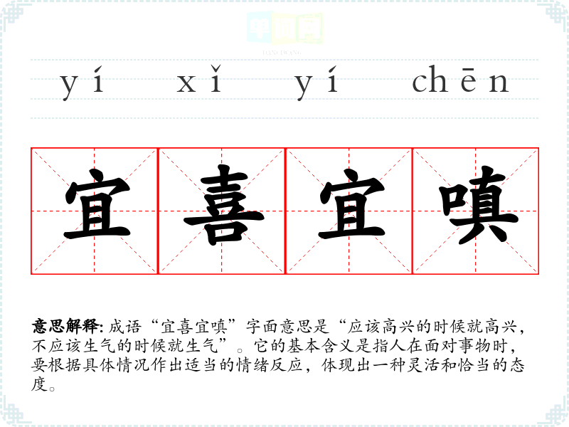 成语“宜喜宜嗔”字面意思是“应该高兴的时候就高兴,不应该生气的时候就生气”。它的基本含义是指人在面对事物时,要根据具体情况作出适当的情绪反应,体现出一种灵活和恰当的态度。