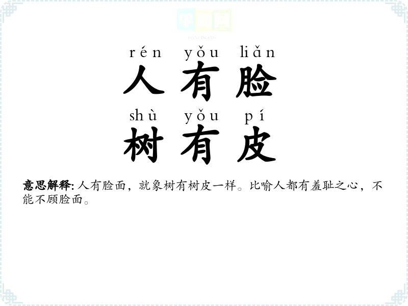 | 人有脸,树有皮 | 人有脸面,就象树有树皮一样。比喻人都有羞耻之心,不能不顾脸面。 |