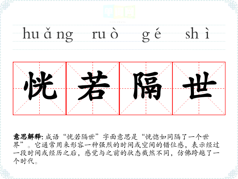 成语“恍若隔世”字面意思是“恍惚如同隔了一个世界”。它通常用来形容一种强烈的时间或空间的错位感,表示经过一段时间或经历之后,感觉与之前的状态截然不同,仿佛跨越了一个时代。