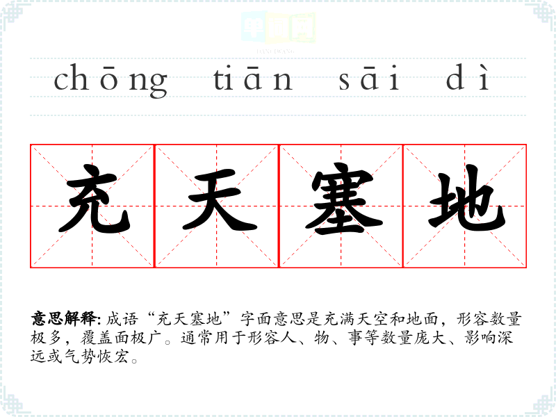 成语“充天塞地”字面意思是充满天空和地面,形容数量极多,覆盖面极广。通常用于形容人、物、事等数量庞大、影响深远或气势恢宏。