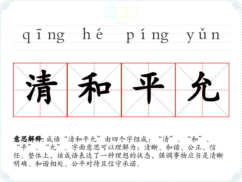 成语“清和平允”由四个字组成:“清”、“和”、“平”、“允”。字面意思可以理解为:清晰、和谐、公正、信任。整体上,该成语表达了一种理想的状态,强调事物应当是清晰明确、和谐相处、公平对待且信守承诺。