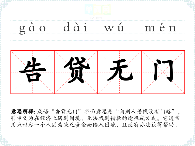 成语“告贷无门”字面意思是“向别人借钱没有门路”,引申义为在经济上遇到困境,无法找到借款的途径或方式。它通常用来形容一个人因为缺乏资金而陷入困境,且没有办法获得帮助。