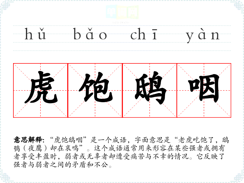 通过对“虎饱鸱咽”的学,我更加深刻地理解了社会中权力与财富的不平衡。在语言学中,这个成语不仅丰富了我的词汇量,也让我在表达时更加关注社会问题,促使我在生活中积极参与公益活动,力求为社会的进步贡献一份力量。