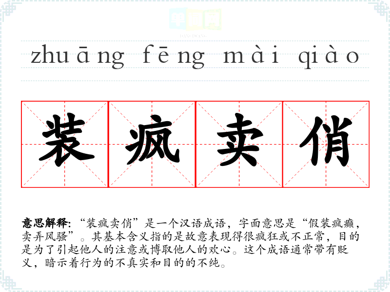 “装疯卖俏”是一个汉语成语,字面意思是“假装疯癫,卖弄风骚”。其基本含义指的是故意表现得很疯狂或不正常,目的是为了引起他人的注意或博取他人的欢心。这个成语通常带有贬义,暗示着行为的不真实和目的的不纯。