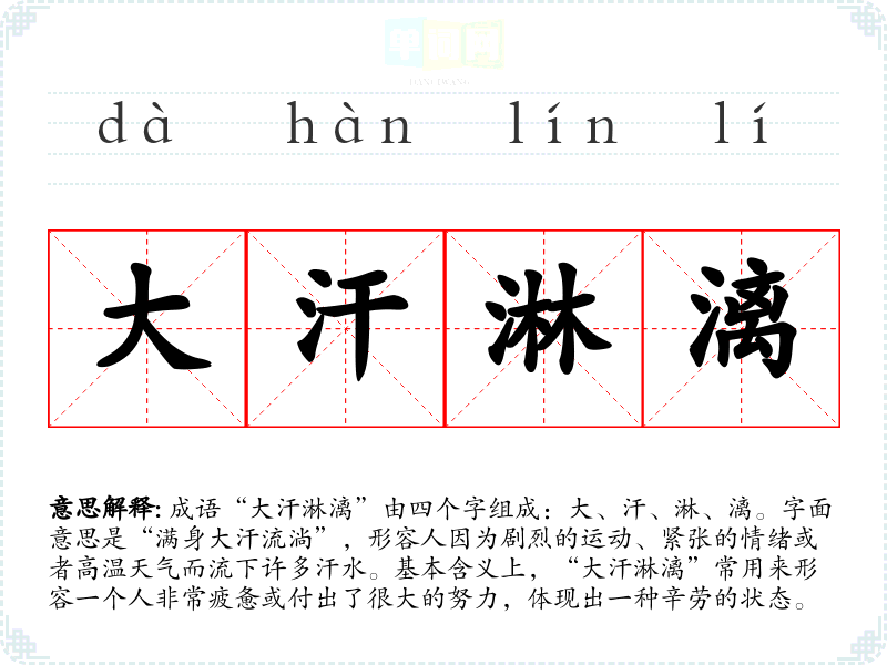 成语“大汗淋漓”由四个字组成:大、汗、淋、漓。字面意思是“满身大汗流淌”,形容人因为剧烈的**、紧张的情绪或者高温天气而流下许多汗水。基本含义上,“大汗淋漓”常用来形容一个人非常疲惫或付出了很大的努力,体现出一种辛劳的状态。