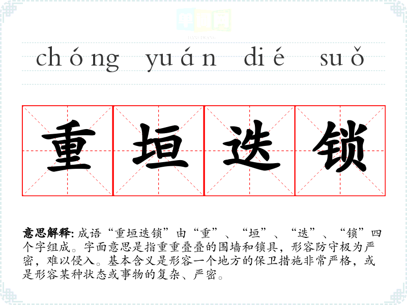 成语“重垣迭锁”由“重”、“垣”、“迭”、“锁”四个字组成。字面意思是指重重叠叠的围墙和锁具,形容防守极为严密,难以侵入。基本含义是形容一个地方的保卫措施非常严格,或是形容某种状态或事物的复杂、严密。