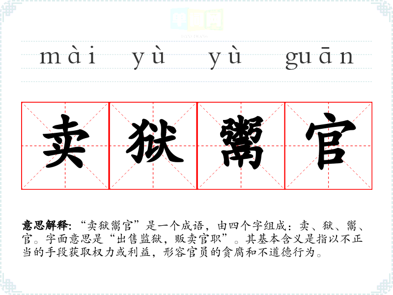 “卖狱鬻官”是一个成语,由四个字组成:卖、狱、鬻、官。字面意思是“出售监狱,贩卖官职”。其基本含义是指以不正当的手段获取权力或利益,形容官员的贪腐和不道德行为。