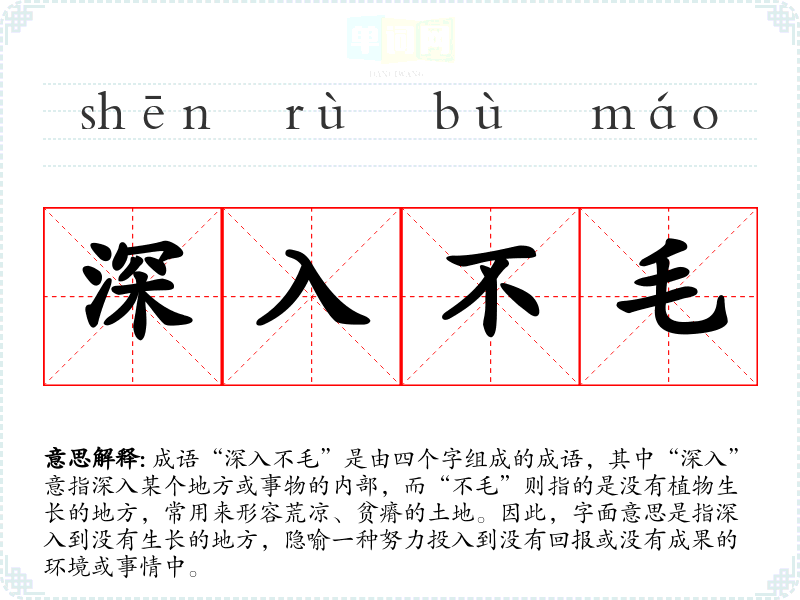 成语“深入不毛”是由四个字组成的成语,其中“深入”意指深入某个地方或事物的内部,而“不毛”则指的是没有植物生长的地方,常用来形容荒凉、贫瘠的土地。因此,字面意思是指深入到没有生长的地方,隐喻一种努力投入到没有回报或没有成果的环境或事情中。