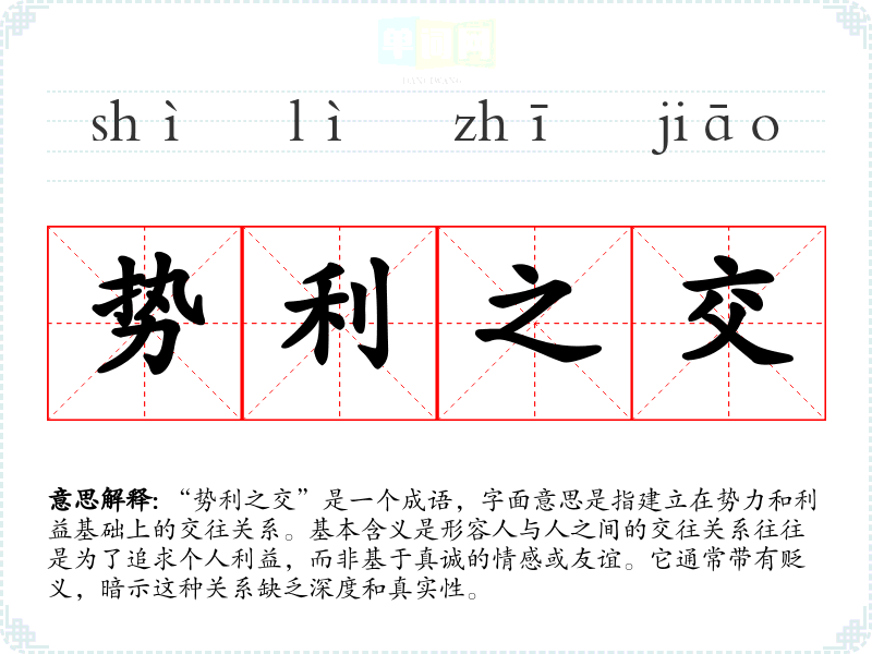 “势利之交”是一个成语,字面意思是指建立在势力和利益基础上的交往关系。基本含义是形容人与人之间的交往关系往往是为了追求个人利益,而非基于真诚的情感或友谊。它通常带有贬义,暗示这种关系缺乏深度和真实性。