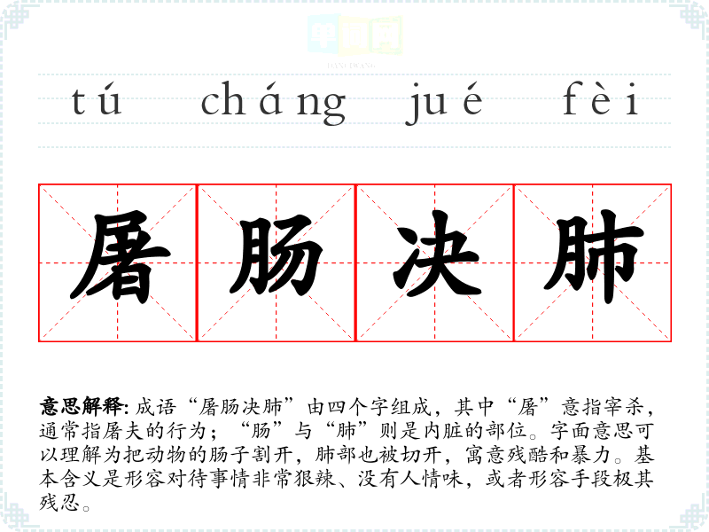 成语“屠肠决肺”由四个字组成,其中“屠”意指宰杀,通常指屠夫的行为;“肠”与“肺”则是内脏的部位。字面意思可以理解为把动物的肠子割开,肺部也被切开,寓意残酷和暴力。基本含义是形容对待事情非常狠辣、没有人情味,或者形容手段极其残忍。