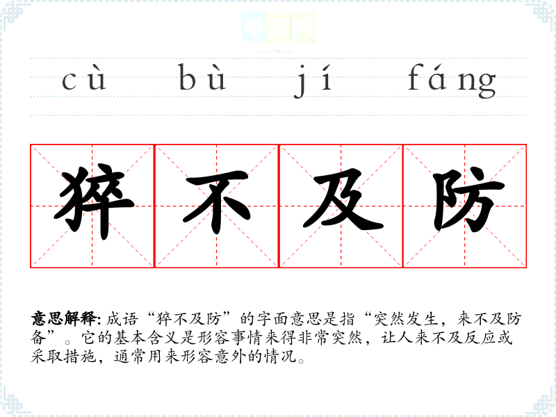 成语“猝不及防”的字面意思是指“突然发生,来不及防备”。它的基本含义是形容事情来得非常突然,让人来不及反应或采取措施,通常用来形容意外的情况。