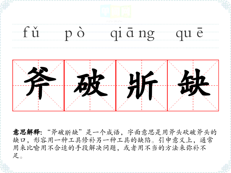“斧破斨缺”是一个成语,字面意思是用斧头砍破斧头的缺口,形容用一种工具修补另一种工具的缺陷。引申意义上,通常用来比喻用不合适的手段解决问题,或者用不当的方法来弥补不足。