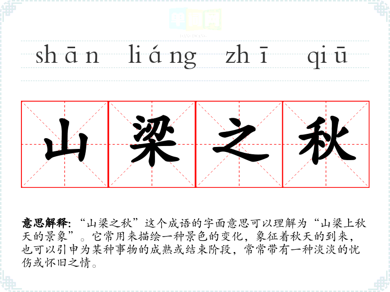 “山梁之秋”并不是一个广为人知的成语,可能源自于古代文学作品中对自然景象的描写。在古代诗词中,山和秋常常被用来表达诗人的情感寄托。例如,杜甫的诗作中就常常有对秋天和山水的描写,反映出诗人对时光流逝的感慨。