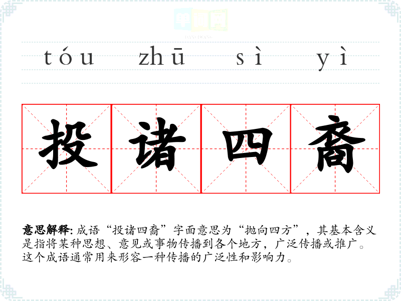 成语“投诸四裔”字面意思为“抛向四方”,其基本含义是指将某种思想、意见或事物传播到各个地方,广泛传播或推广。这个成语通常用来形容一种传播的广泛性和影响力。