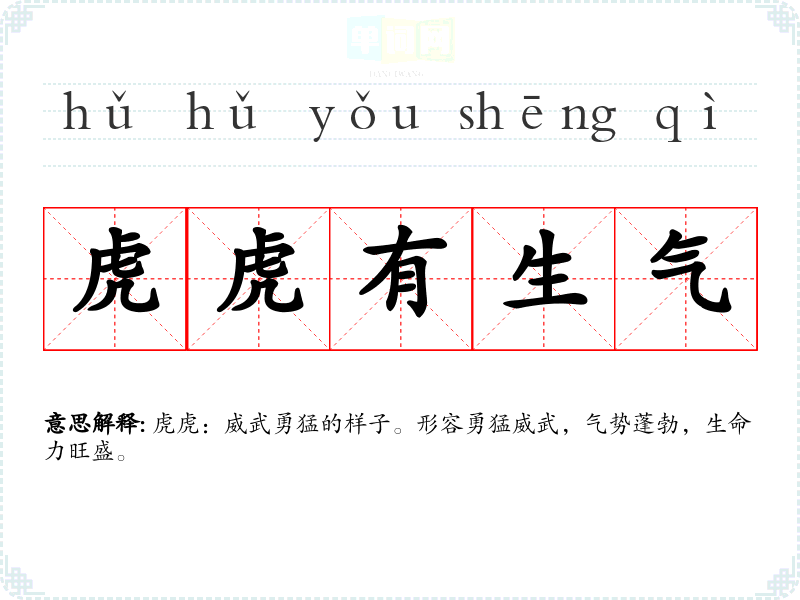 虎虎:威武勇猛的样子。形容勇猛威武,气势蓬勃,生命力旺盛。