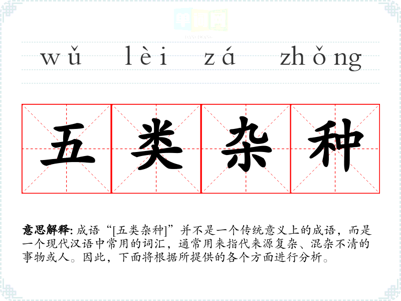 成语“[五类杂种]”并不是一个传统意义上的成语,而是一个现代汉语中常用的词汇,通常用来指代来源复杂、混杂不清的事物或人。因此,下面将根据所提供的各个方面进行分析。