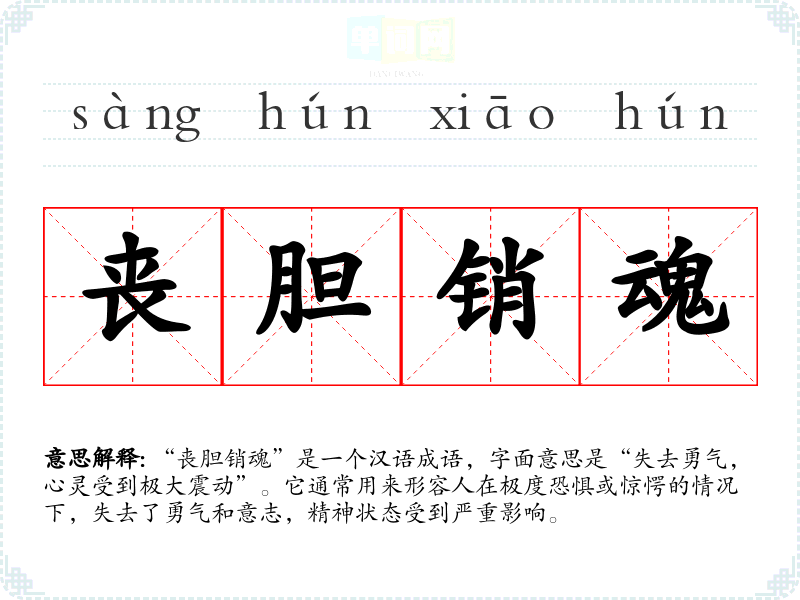 “丧胆销魂”是一个汉语成语,字面意思是“失去勇气,心灵受到极大震动”。它通常用来形容人在极度恐惧或惊愕的情况下,失去了勇气和意志,精神状态受到严重影响。