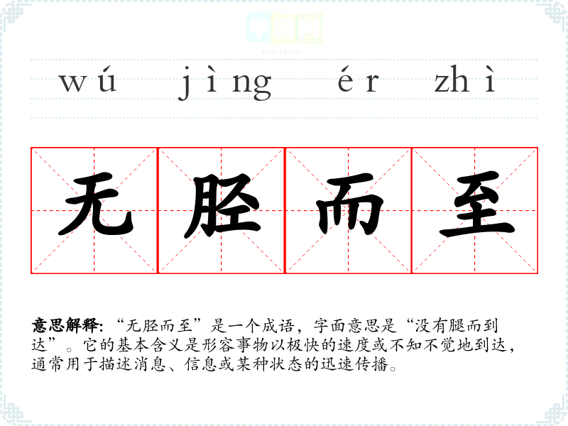 “无胫而至”是一个成语,字面意思是“没有腿而到达”。它的基本含义是形容事物以极快的速度或不知不觉地到达,通常用于描述消息、信息或某种状态的迅速传播。