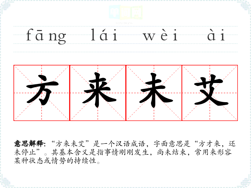 “方来未艾”是一个汉语成语,字面意思是“方才来,还未停止”。其基本含义是指事情刚刚发生,尚未结束,常用来形容某种状态或情势的持续性。