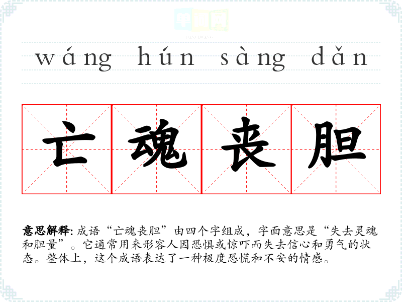 成语“亡魂丧胆”由四个字组成,字面意思是“失去灵魂和胆量”。它通常用来形容人因恐惧或惊吓而失去信心和勇气的状态。整体上,这个成语表达了一种极度恐慌和不安的情感。