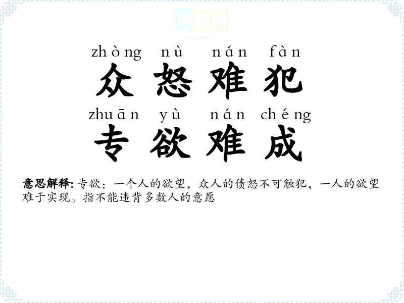 | 众怒难犯,专欲难成 | 专欲:一个人的欲望,众人的债怒不可触犯,一人的欲望难于实现。指不能违背多数人的意愿 |