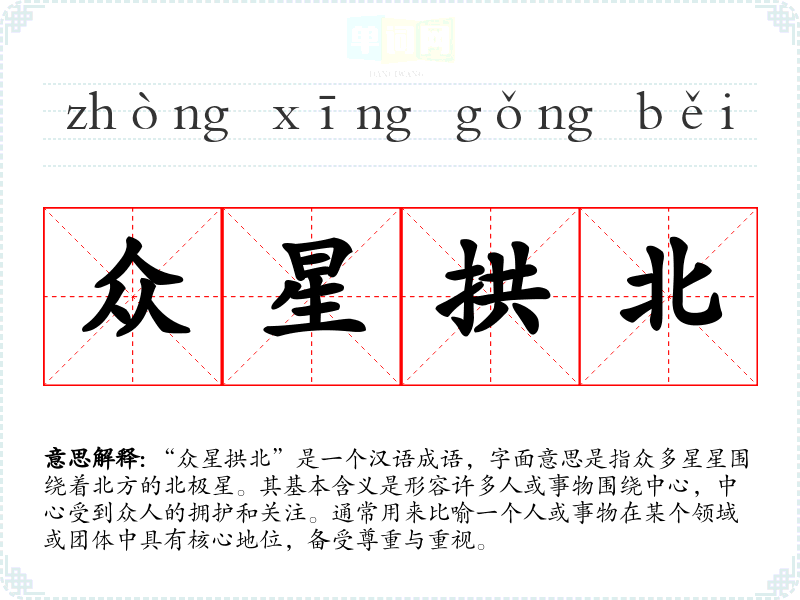 在**传统文化中,北极星象征着稳定与指引,因此“众星拱北”也体现了人们对领导者或英雄的崇敬。在现代社会,这个成语依然适用,尤其是在团队合作、企业管理和政治领导中,强调一个人如何成为核心并吸引他人的支持。