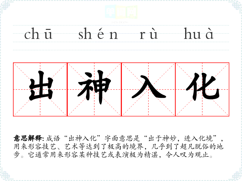 成语“出神入化”字面意思是“出于神妙,进入化境”,用来形容技艺、艺术等达到了极高的境界,几乎到了超凡脱俗的地步。它通常用来形容某种技艺或表演极为精湛,令人叹为观止。