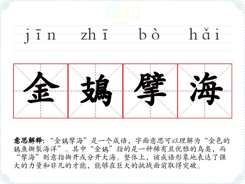 “金鳷擘海”是一个成语,字面意思可以理解为“金色的鳷鱼撕裂海洋”。其中“金鳷”指的是一种稀有且优雅的鸟类,而“擘海”则意指撕开或分开大海。整体上,该成语形象地表达了强大的力量和非凡的才能,能够在巨大的挑战面前取得突破。