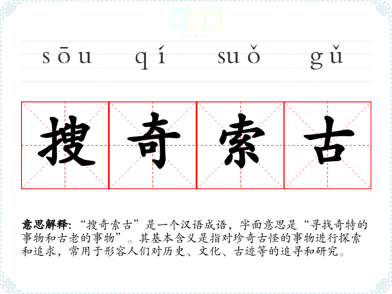 | 搜奇访古 | 搜寻奇山异水,访问名胜古迹。 |