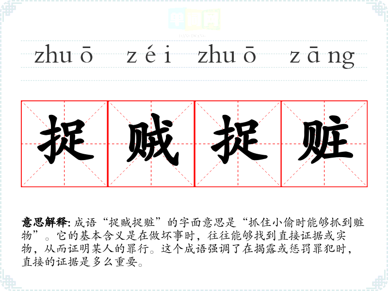 成语“捉贼捉赃”的字面意思是“抓住小偷时能够抓到赃物”。它的基本含义是在做坏事时,往往能够找到直接证据或实物,从而证明某人的罪行。这个成语强调了在揭露或惩罚罪犯时,直接的证据是多么重要。