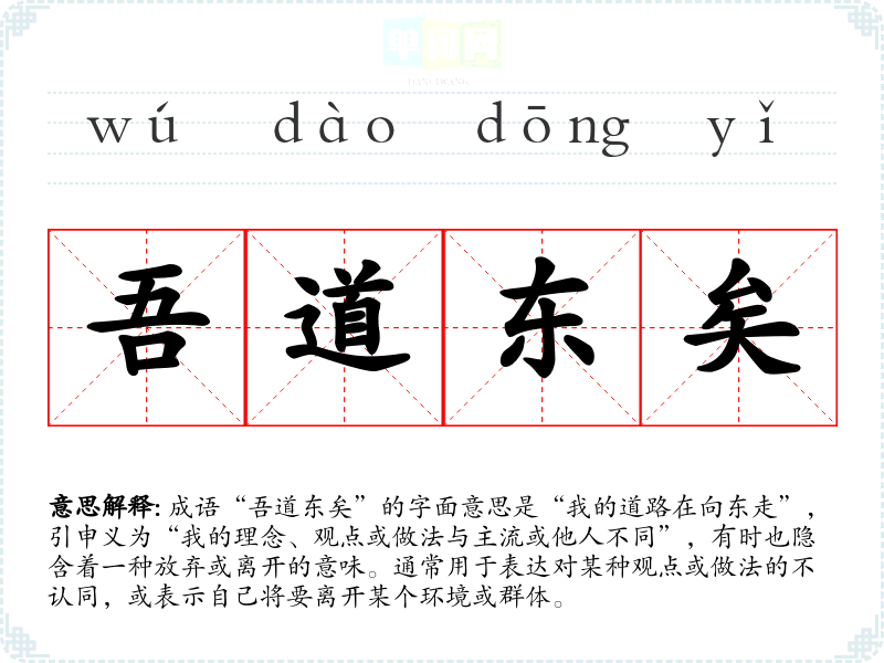 成语“吾道东矣”的字面意思是“我的道路在向东走”,引申义为“我的理念、观点或做法与主流或他人不同”,有时也隐含着一种放弃或离开的意味。通常用于表达对某种观点或做法的不认同,或表示自己将要离开某个环境或群体。