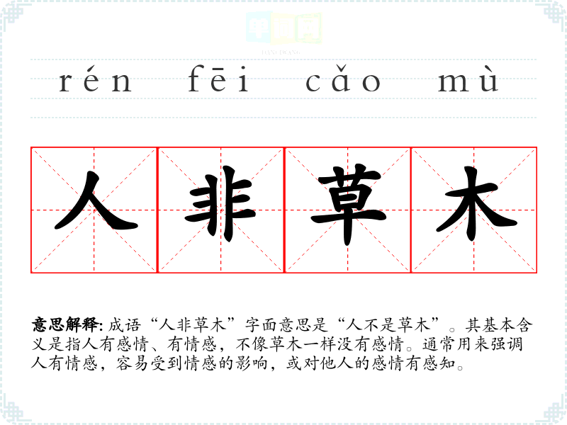 | 人非草木 | 指人是有思想感情的,容易为外界事物所打动,不同于无生命、无知觉、无感情的树木石头。同“人非木石”。 |