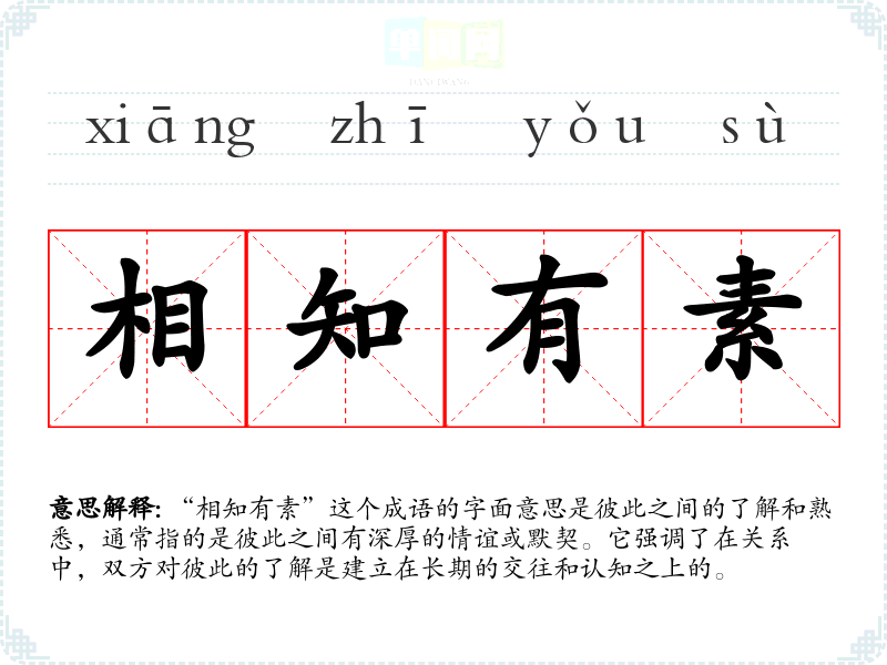 “相知有素”这个成语的字面意思是彼此之间的了解和熟悉,通常指的是彼此之间有深厚的情谊或默契。它强调了在关系中,双方对彼此的了解是建立在长期的交往和认知之上的。