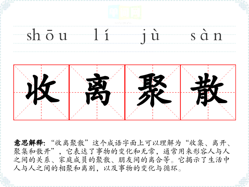 “收离聚散”这个成语字面上可以理解为“收集、离开、聚集和散开”,它表达了事物的变化和无常,通常用来形容人与人之间的关系、家庭成员的聚散、朋友间的离合等。它揭示了生活中人与人之间的相聚和离别,以及事物的变化与循环。