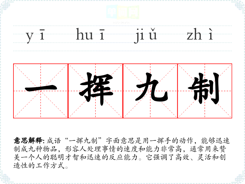 成语“一挥九制”字面意思是用一挥手的动作,能够迅速制成九种物品,形容人处理事情的速度和能力非常高,通常用来赞美一个人的聪明才智和迅速的反应能力。它强调了高效、灵活和创造性的工作方式。