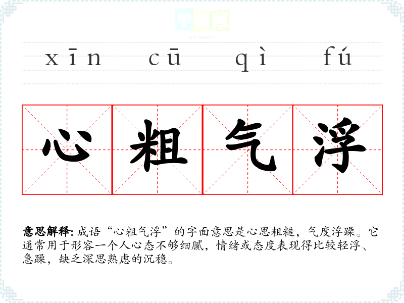 成语“心粗气浮”的字面意思是心思粗糙,气度浮躁。它通常用于形容一个人心态不够细腻,情绪或态度表现得比较轻浮、急躁,缺乏深思熟虑的沉稳。