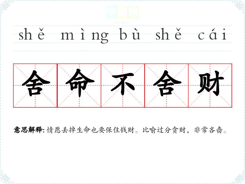 | 舍命不舍财 | 情愿丢掉生命也要保住钱财。比喻过分贪财,非常吝啬。 |