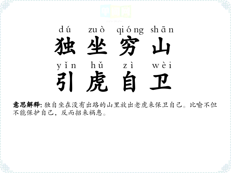 | 独坐穷山,引虎自卫 | 独自坐在没有出路的山里放出老虎来保卫自己。比喻不但不能保护自己,反而招来祸患。 |
