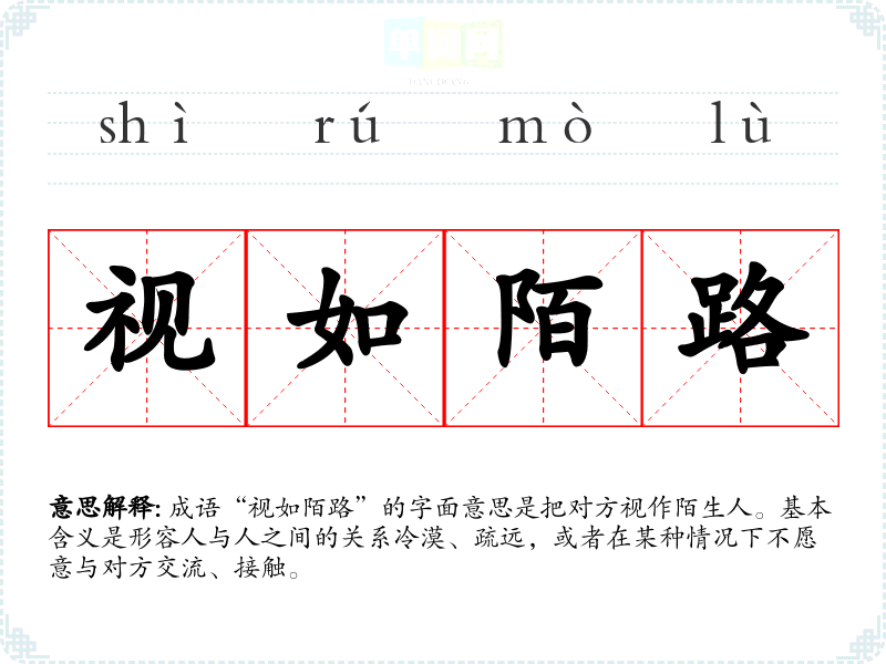 成语“视如陌路”的字面意思是把对方视作陌生人。基本含义是形容人与人之间的关系冷漠、疏远,或者在某种情况下不愿意与对方交流、接触。