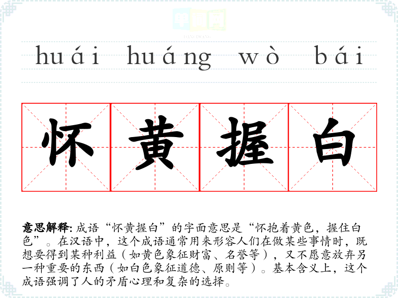 成语“怀黄握白”的字面意思是“怀抱着黄色,握住白色”。在汉语中,这个成语通常用来形容人们在做某些事情时,既想要得到某种利益(如黄色象征财富、名誉等),又不愿意放弃另一种重要的东西(如白色象征道德、原则等)。基本含义上,这个成语强调了人的矛盾心理和复杂的选择。