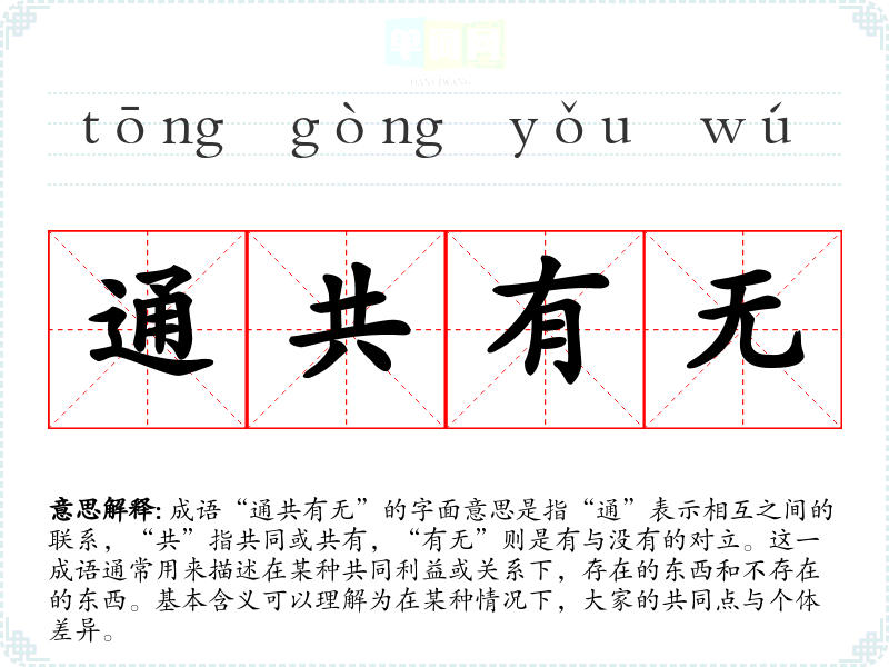 成语“通共有无”的字面意思是指“通”表示相互之间的联系,“共”指共同或共有,“有无”则是有与没有的对立。这一成语通常用来描述在某种共同利益或关系下,存在的东西和不存在的东西。基本含义可以理解为在某种情况下,大家的共同点与个体差异。