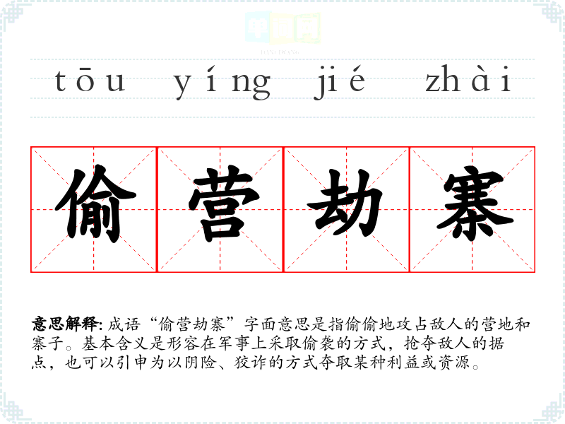 成语“偷营劫寨”字面意思是指偷偷地攻占敌人的营地和寨子。基本含义是形容在军事上采取偷袭的方式,抢夺敌人的据点,也可以引申为以阴险、狡诈的方式夺取某种利益或资源。