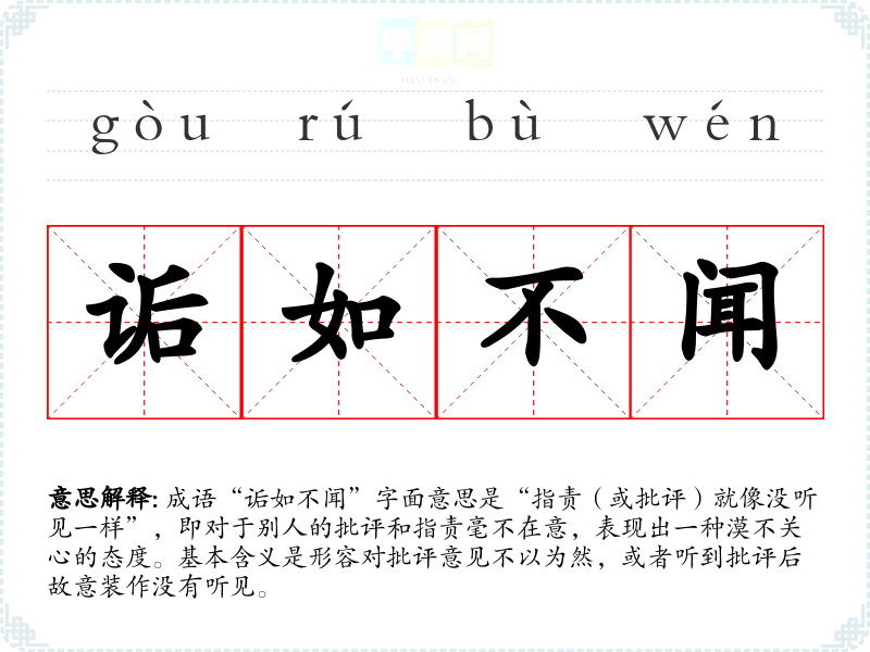 成语“诟如不闻”字面意思是“指责(或批评)就像没听见一样”,即对于别人的批评和指责毫不在意,表现出一种漠不关心的态度。基本含义是形容对批评意见不以为然,或者听到批评后故意装作没有听见。