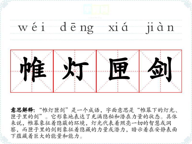 “帷灯匣剑”是一个成语,字面意思是“帷幕下的灯光、匣子里的剑”。它形象地表达了充满隐秘和潜在力量的状态。具体来说,帷幕象征着隐蔽的环境,灯光代表着照亮一切的智慧或洞察,而匣子里的剑则象征着隐藏的力量或潜力,暗示着在安静表面下蕴藏着巨大的能量和能力。