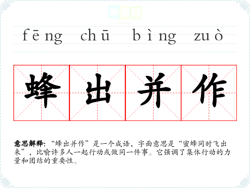 “蜂出并作”是一个成语,字面意思是“蜜蜂同时飞出来”,比喻许多人一起行动或做同一件事。它强调了集体行动的力量和团结的重要性。