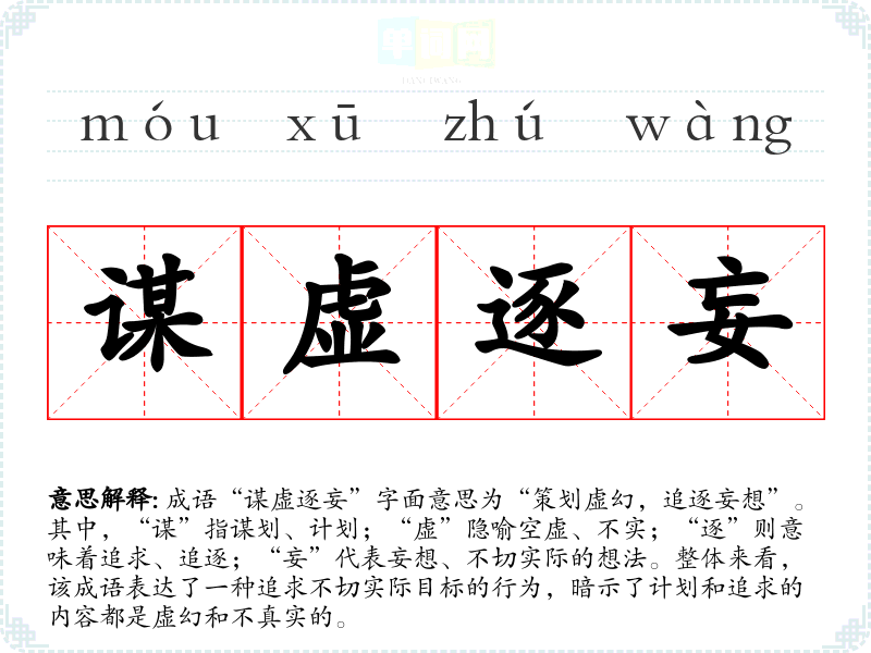 | 谋虚逐妄 | 谋:谋求;虚:不真实;逐:追逐;妄:不存在。追求一种不存在或不合理的事物。 |