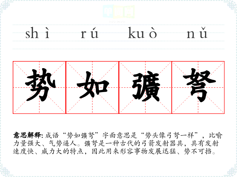 成语“势如彍弩”字面意思是“势头像弓弩一样”,比喻力量强大、气势逼人。彍弩是一种古代的弓箭发射器具,具有发射速度快、威力大的特点,因此用来形容事物发展迅猛、势不可挡。