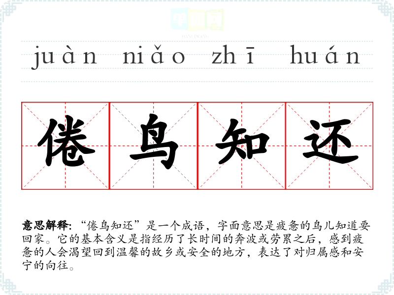 “倦鸟知还”是一个成语,字面意思是疲惫的鸟儿知道要回家。它的基本含义是指经历了长时间的奔波或劳累之后,感到疲惫的人会渴望回到温馨的故乡或安全的地方,表达了对归属感和安宁的向往。