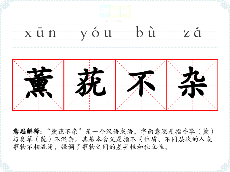 “薰莸不杂”是一个汉语成语,字面意思是指香草(薰)与臭草(莸)不混杂。其基本含义是指不同性质、不同层次的人或事物不相混淆,强调了事物之间的差异性和独立性。